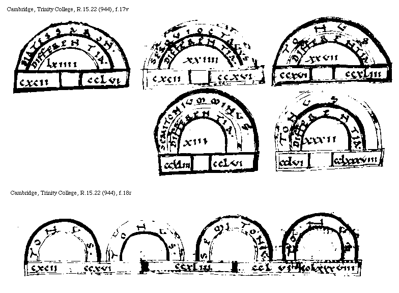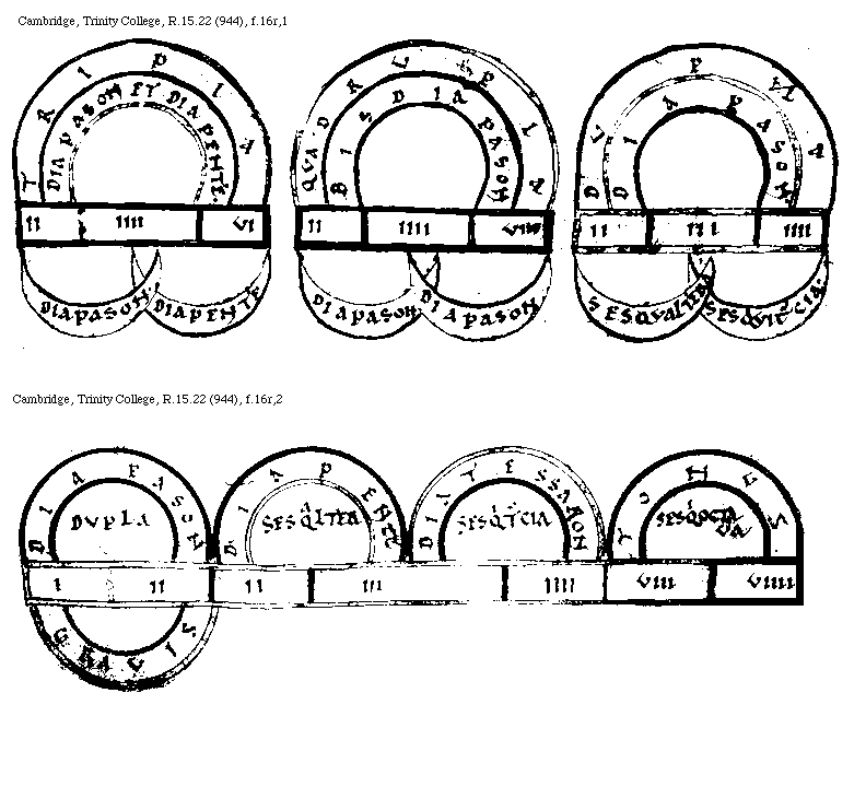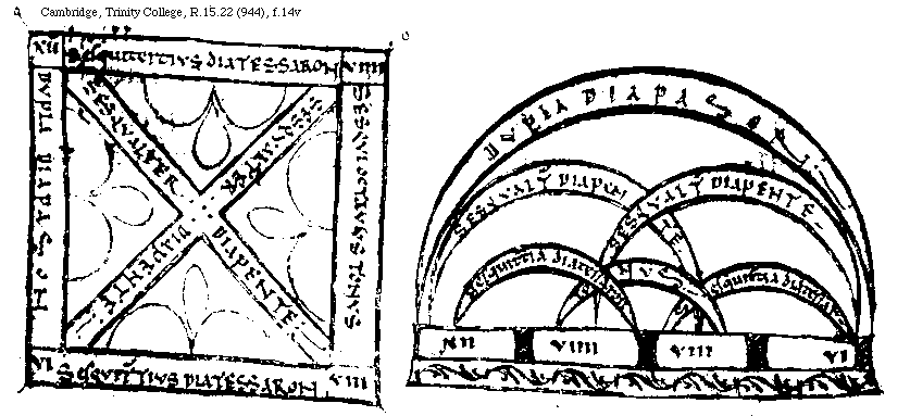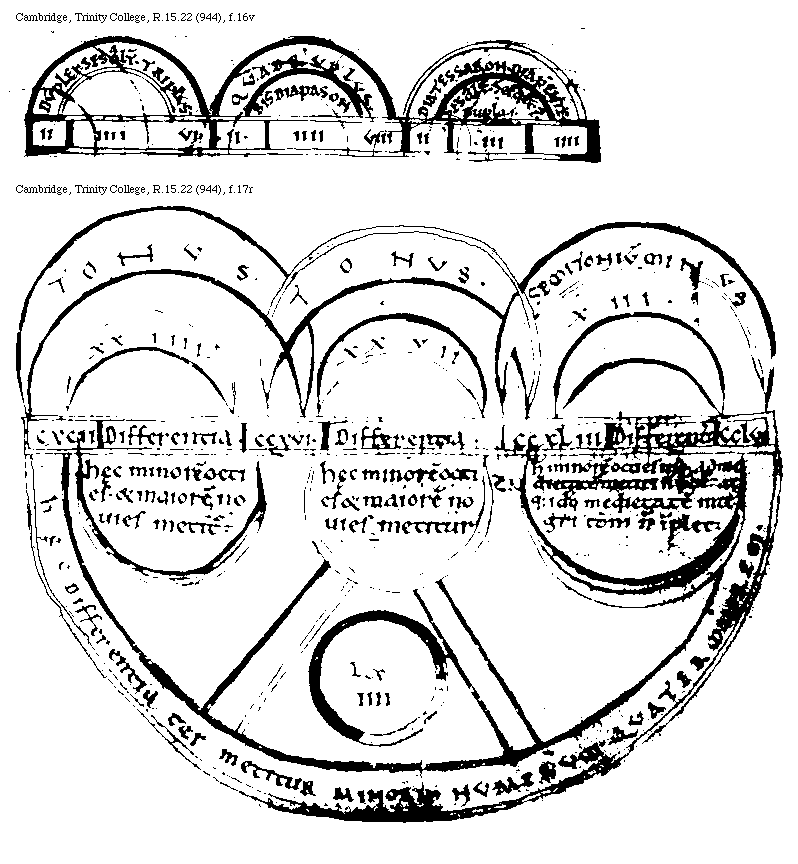 [Cambridge, Trinity College, R.15.22 (944), f.16r,2; text: DIAPASON, DIAPENTE, DIATESSARON, TONVS, Dupla, Sesqualtera, Sesquitertia, Sesquioctaua, I, II, III, IIII, VIII, VIIII, GRAVIS] [BOEMUS1C 02GF]