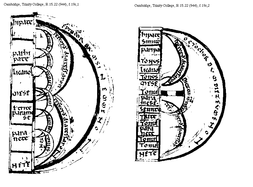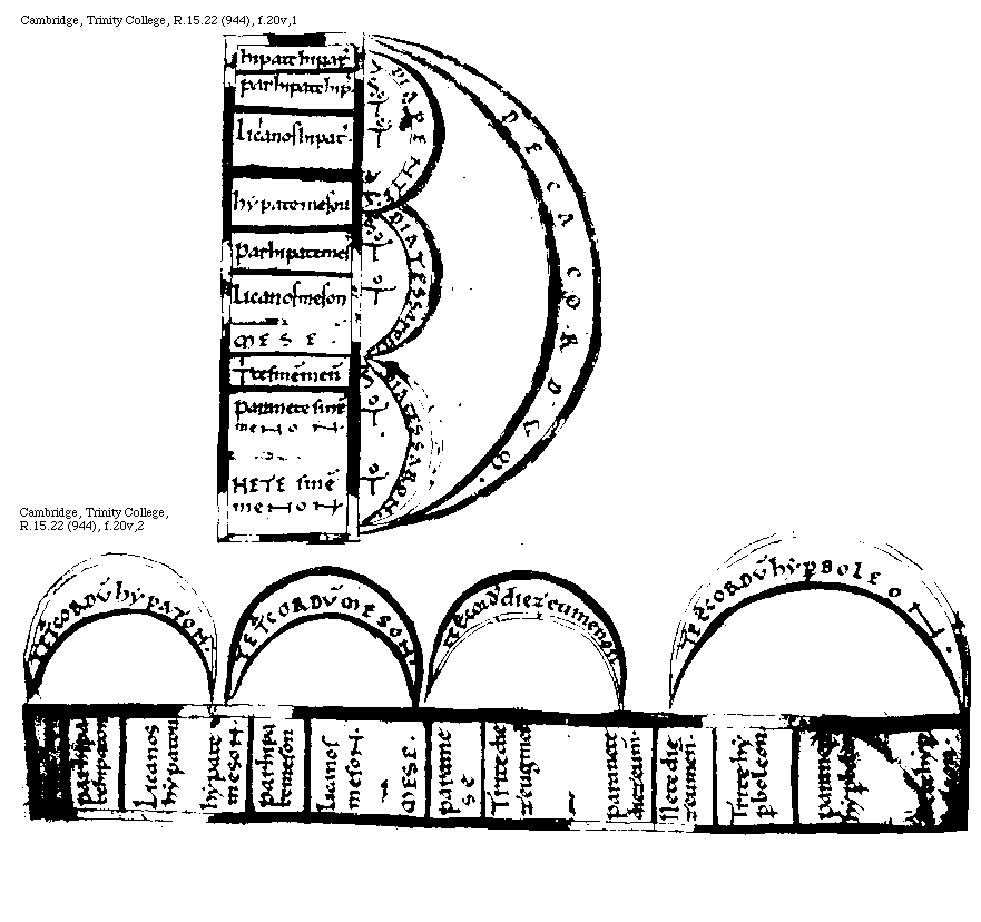 [Cambridge, Trinity College, R.15.22 (944), f.20v,1; text: Decacordum. Diapente. Diatessaron, Semitonium, Tonus, hipate hipaton, parhipate hipaton, Licanos [Lichanos corr. supra lin.] hipaton, hypate meson, parhipate meson, Licanos meson, MESE. Trite sinemmenon, paranete sinemmenon, NETE sinemmenon] [BOEMUS1C 08GF]