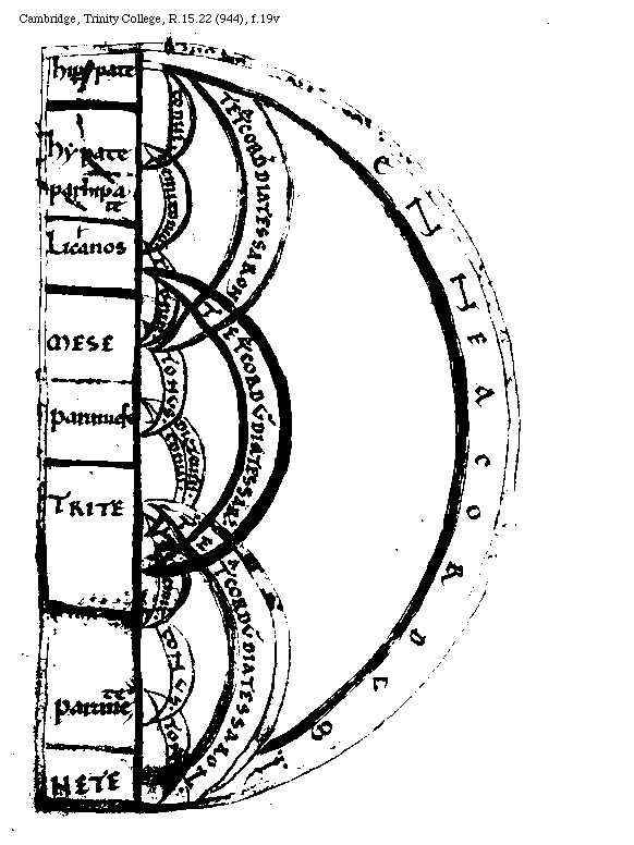 [Cambridge, Trinity College, R.15.22 (944), f.19r,1; text: hipate, parhipate, lichanos, MESE, trite paramese, paranete, NETE, Eptacordum Sinemmenon, tetracordum diatessaron, semitonium, tonus] [BOEMUS1C 05GF]