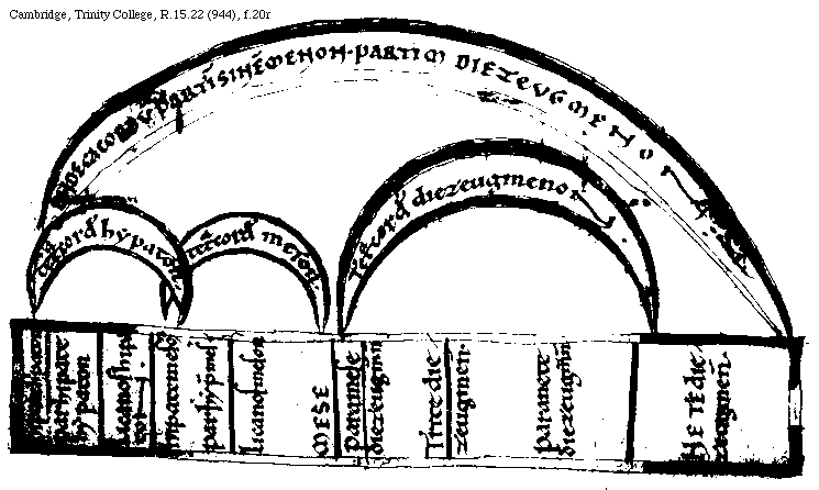 [Cambridge, Trinity College, R.15.22 (944), f.20r; text: Endecacordum partim sinemmenon. partim diezeugmenon. tetracordum hypaton, tetracordum meson, tetracordum diezeugmenon. hipate hipaton, parhipate hypaton, Licanos hipaton. hipate meson, parhypate meson. Licanos meson, MESE, paramese, diezeugmenon, Trite diezeugmenon. paranete diezeugmenon, NETE diezeugmenon.] [BOEMUS1C 07GF]