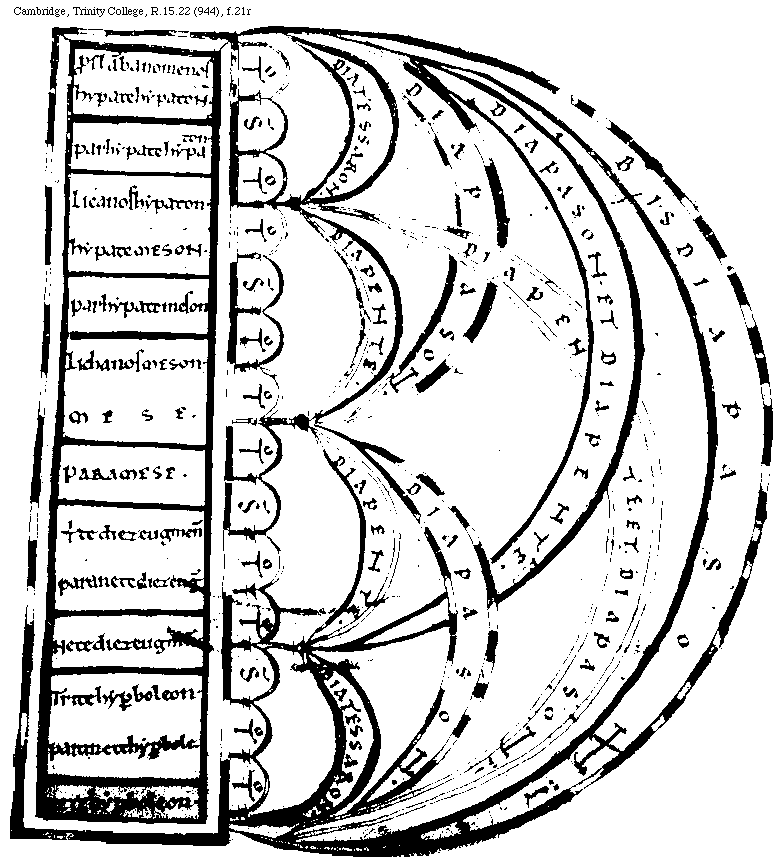 [Cambridge, Trinity College, R.15.22 (944), f.21r; text: Bisdiapason. Diapason et Diapente. Diapente et Diapason. Diapason. Diapente. Diatessaron. Tonus. Semitonium. proslambanomenos, hypate hypaton. parhypate hypaton. Licanos [Lichanos corr. supra lin.] hypaton. hypate meson. parhypate meson. Lichanos meson. MESE. paramese. Trite diezeugmenon. paranete diezeugmenon. nete diezeugmenon. Trite hyperboleon. paranete hyperboleon. nete hyperboleon.] [BOEMUS1C 09GF]