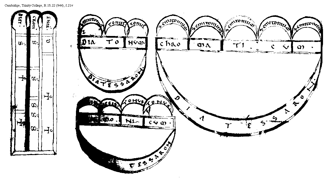 [Cambridge, Trinity College, R.15.22 (944), f.21v; text: Enarmonium. Cromaticum. Diatonum. Diesis. Tonus. Semitonium. Diatessaron. Diatonum. Chromaticum. Enarmonicum. Diesis. Tonus. Semitonium.] [BOEMUS1C 10GF]