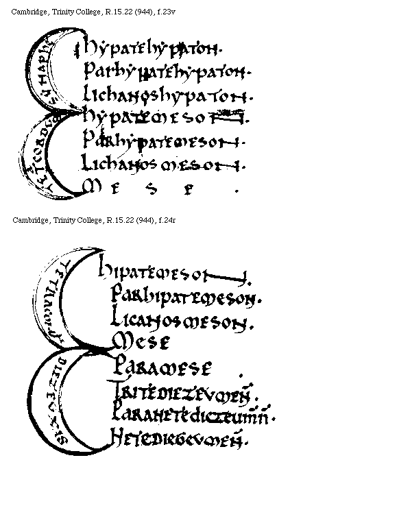 [Cambridge, Trinity College, R.15.22 (944), f.20v,2; text: Tetracordum hypaton. Tetracordum meson. Tetracordum diezeumenon, Tetracordum hyperboleon. hipate hipaton, parhipate hipaton, Lichanos hypaton, hypate meson, parhipate meson, Licanos meson. MESE. paramese, Trite diezeugmenon, paranete diezeugmenon. Nete diezeugmenon, Trite hyperboleon, paranete hyperboleon, nete hyperboleon.] [BOEMUS1C 08GF]