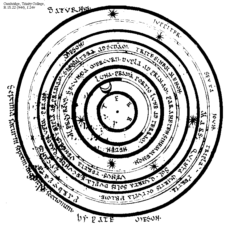 [Cambridge, Trinity College, R.15.22 (944), f.24v; text: Septima Saturni septem uigintiaque sectionum, Hypate Meson, Saturnus, Iuppiter. Sexta Iouis Tripla Tertia, Parhypate, Mars. Quinta Martis octupla prime, Lycanos, Sol. Quarta Solis dupla secunde. Quadrupla prime. Meson, Venus. Tertia Veneris. Tripla ad primam. sesqualtera ad secundam. Trite Sinemmenon. Mercurius. Secunda Mercurii. Dupla ad primam. Paraneten synemmenon. Luna. Prima portio Lune ad Terram. Neten. Terra.] [BOEMUS1C 13GF]