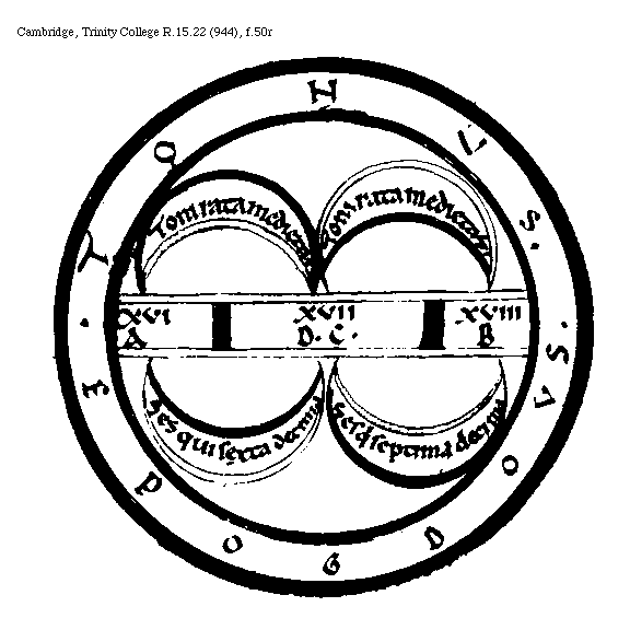 [Cambridge, Trinity College, R.15.22 (944), f.50r; text: Sesquisextadecima, Sesquiseptimadecima, XVI, XVII, XVIII, A, D. C. B, Toni rata medietas, Tonus, Epogdous] [BOEMUS3C 01GF]