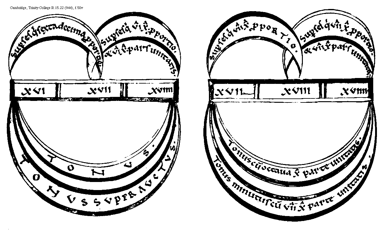 [Cambridge, Trinity College, R.15.22 (944), f.50v; text: Supersesquisextadecima proportio, et sextadecima pars unitatis, XVI, XVII, XVIIII, TONVS, Tonus superauctus, Supersesquiseptimadecima proportio, et septimadecima pars unitatis, XVIII, Tonus cum octauadecima parte unitatis, Tonus minutus cum septimadecima parte unitatis] [BOEMUS3C 02GF]