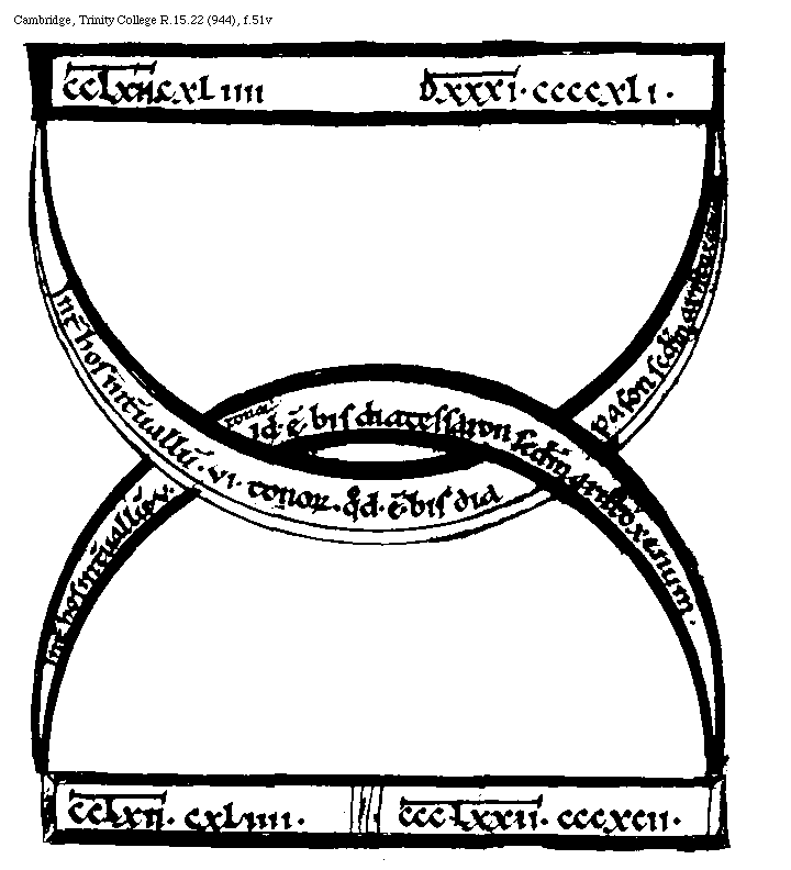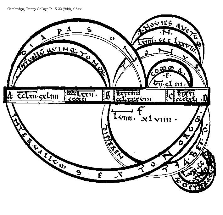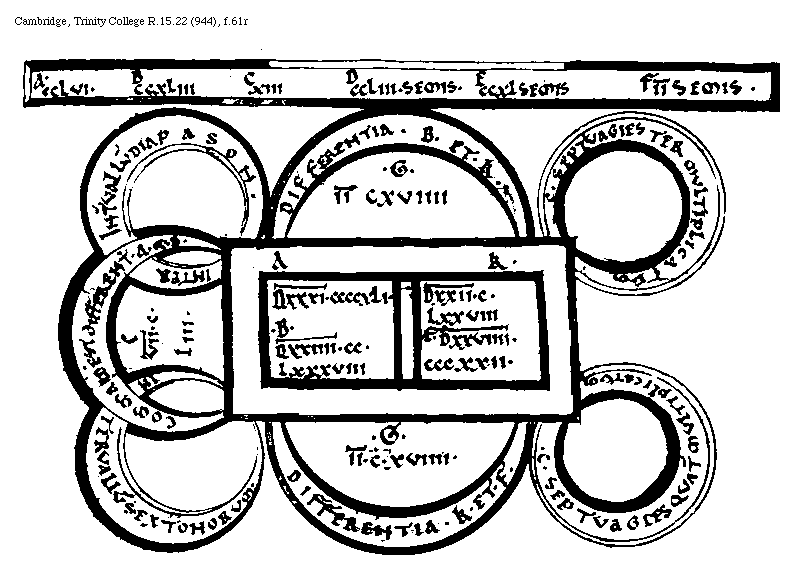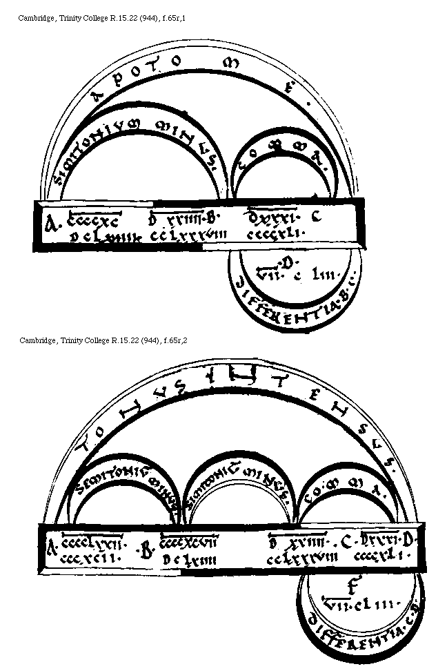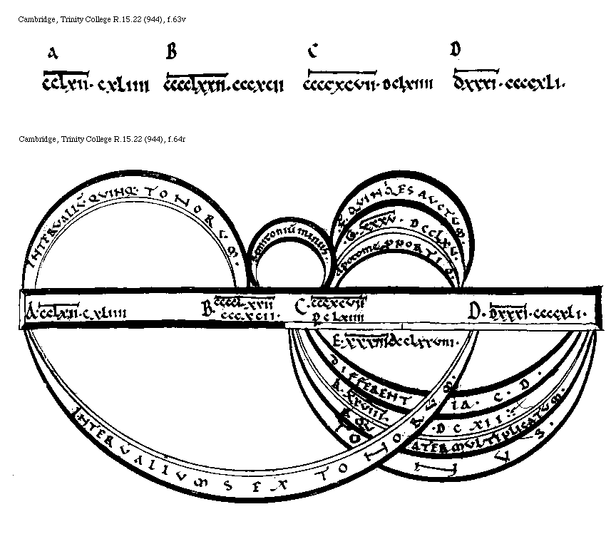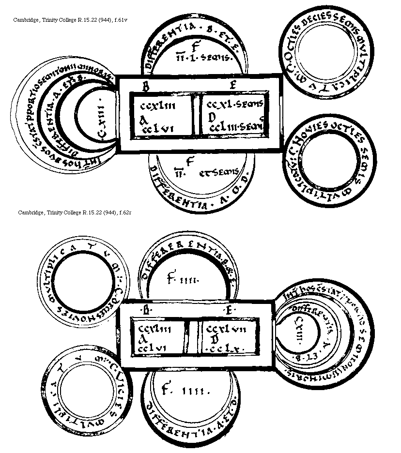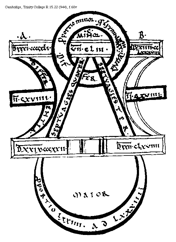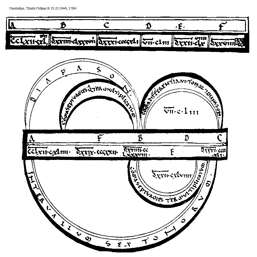 [Cambridge, Trinity College, R.15.22 (944), f.59v; text: A, B, C, D, E, F, Septuagies quinquies multiplicatum, Interuallum Diapason, Septuagies quater multiplicatum, Interuallum Sex Tonorum, Differentia, DXXXVI[macron supra lin.].CCCCLXXV. DXXIIII[macron supra lin.].CCLXXXVIII. V[macron supra lin.].XXXIIII. VII[macron supra lin.].CLIII. DXXVIIII[macron supra lin.].CCCXXII. DXXXI[macron supra lin.]CCCCXII.] [BOEMUS3C 17GF]