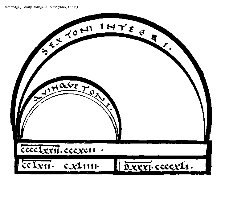 [Cambridge, Trinity College, R.15.22 (944), f.52r,2; text: Quinque toni integri. Diatessaron intensa. Differentia medio, Diatessaron remissa. Tonus, Semitonium, IIII[macron supra lin.].DCCLXVIII et Bisse, A. CCLXII[macron supra lin.].CXLIIII, B, C. CCCCLXXII[macron supra lin.].CCCXCII. D. CCCXLIX[macron supra lin.].DXXV. et triens. CCCLIIII[macron supra lin.].CCXCIIII.] [BOEMUS3C 05GF]