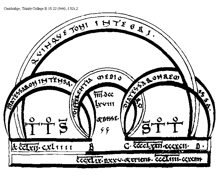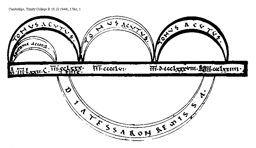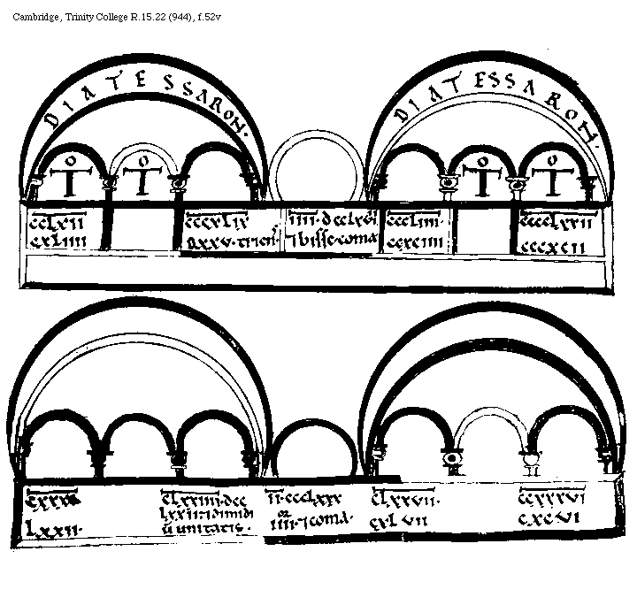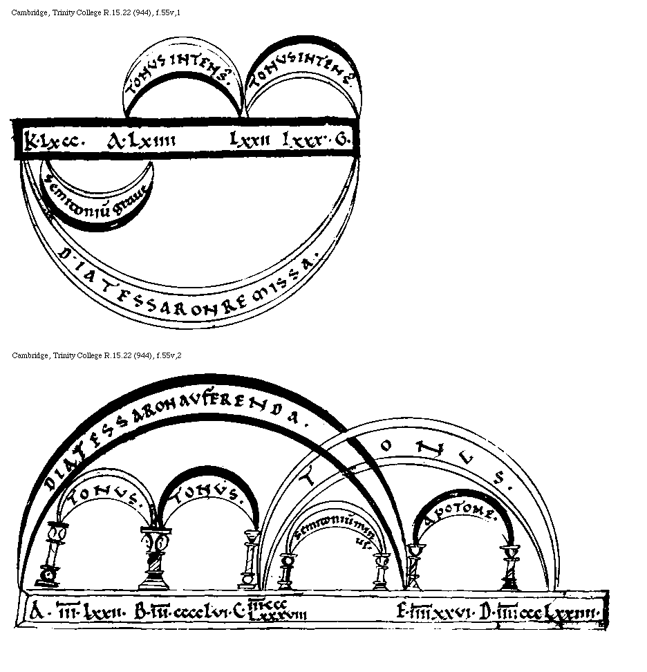 [Cambridge, Trinity College, R.15.22 (944), f.56r,1; text: Tonus acutus, Apotome acuta, Diatessaron remissa, A, B, C, III[macron supra lin.].LXXII, III.[macron supra lin.].CCLXXX. et bisse, III[macron supra lin.].CCCCLVI, III[macron supra lin.].D.CCCLXXXVIII, IIII[macron supra lin.].CCCLXXIIII] [BOEMUS3C 11GF]
