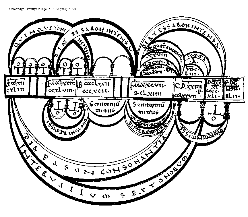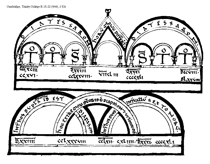[Cambridge, Trinity College, R.15.22 (944), f.63r; text: Quinque Toni Intensi, Diatessaron Intensa, Tonus, .K. Quater auctum. XXVIII[macron supra lin.].DCXII. N, L, Ter auctum. XXI.CCCC.LVIIII, Comma, VII[macron supra lin.].C.LIII. A, CCLXII[macron supra lin.]CXLIII, E, CCCLXXIII[macron supra lin.]CCXLVIII. B, CCCCLXXII[macron supra lin.]CCCXCII. F, CCCCXCVII[macron supra lin.].D.CLXIIII, C, DXXIIII[macron supra lin.]CCLXXVII. .P. D, DXXXI[macron supra lin.].CCCC.XLI. G, DCLXIII[macron supra lin.].DLII. Semitonium minus, Duo Toni Remissi. differentia .F. et .C. M, XXVI[macron supra lin.].DCXXIIII. Diapason Consonantia. Interuallum Sex Tonorum.] [BOEMUS3C 21GF]