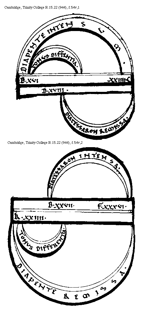 [Cambridge, Trinity College, R.15.22 (944), f.54v,1; text: Diapente intensum, Diatessaron remissa, Tonus diffentia, B, C, D, XVI, XXIIII, XVIII] [BOEMUS3C 08GF]