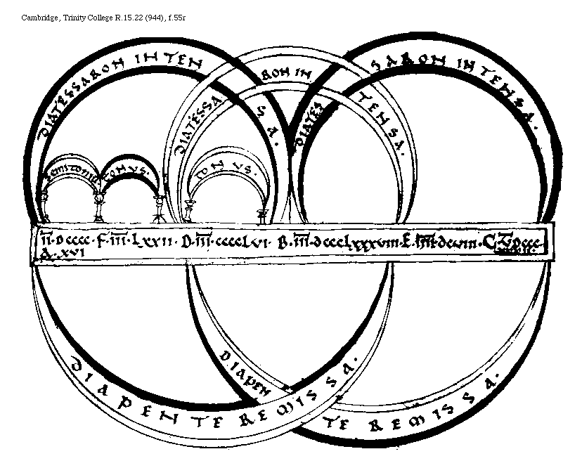 [Cambridge, Trinity College, R.15.22 (944), f.55r; text: Diatessaron intensa, semitonium, tonus, C, E, B, D, F, A, Diapente remissa, II[macron supra lin.].DCCCCXVI, III[macron supra lin.].LXXII, III[macron supra lin.].CCCCLVI, III[macron supra lin.].DCCCLXXXVIII, IIII[macron supra lin.].DCVIII, V[macron supra lin.]DCCCXXXII] [BOEMUS3C 09GF]