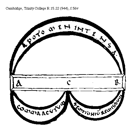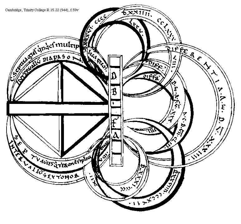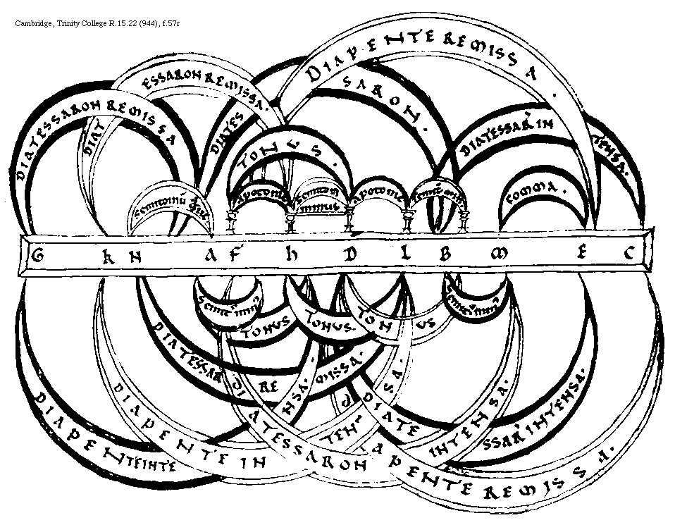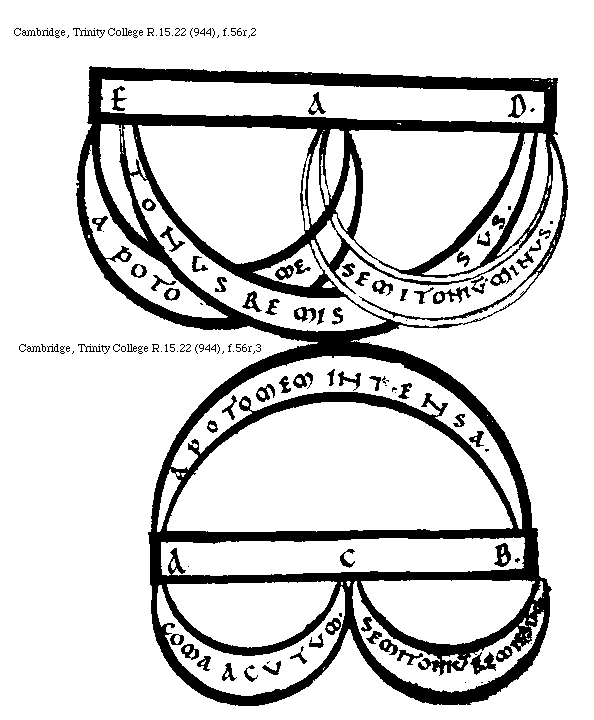 [Cambridge, Trinity College, R.15.22 (944), f.56r,3; text: A, C, B, Apotome intensa, Coma acutum, Semitonium remissum] [BOEMUS3C 12GF]