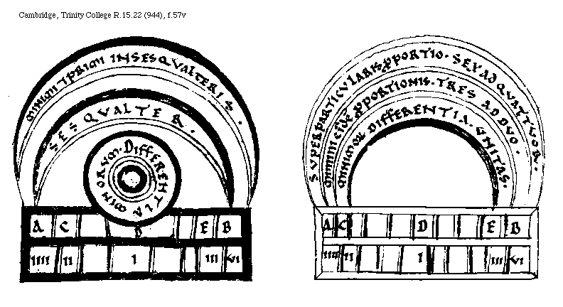 [Cambridge, Trinity College, R.15.22 (944), f.57v; text: Minimi et primi in sesqualteris, Sesqualter, Minorum Differentia, Superparticularis proportio. Sex ad Quattuor, Minimi eiusdem proportionis. Tres ad Duo, Minimorum Differentia. Vnitas. A, C, D, E, B, I, II, III, IIII, VI] [BOEMUS3C 15GF]