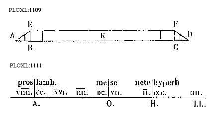 [PLCXL:1111; text: proslambanomenos, mese, nete hyperboleon, A. O. H. LL. VIII[macron supra lin.]. CC. XVI. IIII[macron supra lin.]. DC. VII. II[macron supra lin.]. CCC. IIII.] [ADEMUSI 01GF]