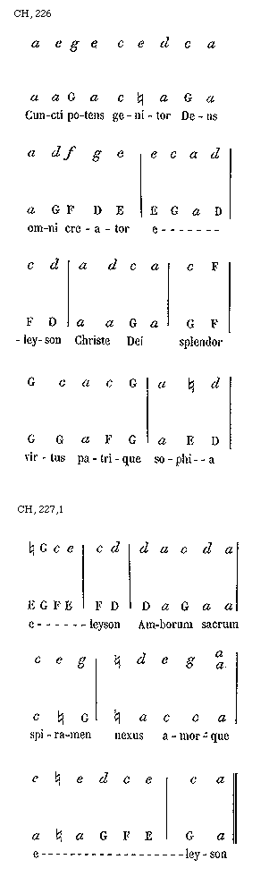 [CH, 226; text: a, e, g, c, d, G, [sqb], F, D, E, Cuncti potens genitor Deus omni creator eleyson, Christe Dei splendor virtus patrique sophia] [ADORFA 01GF]