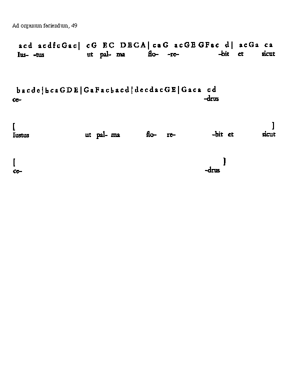 [49] [Ad organum faciendum, 49; text: a, b, [sqb], c, d, e, f, A, C, D, E, F, G, Iustus ut palma florebit et sicut cedrus] [ADORFAC 03GF]