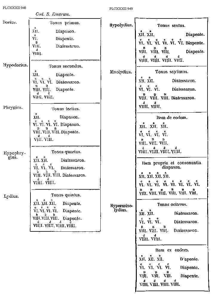 [944] Sciendum quoque, quod Dorius maxime proto regitur, similiter Phrygius deutero, Lydius trito, mixolydius tetrardo. Quos sonos in quibusdam cantilenis suae plagae quodammodo tangendo libant, ut plaga proti tangat protum, deuteri deuterum, triti tritum, tetrardi tetradum. Et id fas est experiri in gradalibus antiphonis. In responsoriis namque nocturnis vel diurnis, seu quibuslibet ecclesiaticis cantilenis, ipsae plagae eorum sonorum limites ad placidum transcendunt, ac species diapason, quas a graviore parte inchoaverant, prout libuerit, percurrunt: quippe singulae chordae finales singulas adoriuntur species. Quarum videlicet specierum metas principalium troporum superius et inferius observantium prima Dorii est, secunda Phrygii, tertia Lydii, quarta mixolydii; siquidem omnes species diapason et superius et inferius inchoari possunt, verbi gratia prima ab O in A vel ab A. in O. Secunda ab x. in b. vel a b. in x. Tertia ab y in c. vel a c in y. Quarta a cc in e. vel ab e in cc. Quinta a dd in h. vel ab h in dd. Sexta ab ff in i. vel ab i in ff. Septima ab nn in m. vel ab m in nn. Sunt igitur quatuor superiores, id est, O. X. y. cc. et tres inferiores H. i. M. Et superiores quidem excellentiori parte fiunt: hypodorium, hypophrygium, hypolydium, hypermixolydium. Inferiores vero fiunt ex graviore parte, Dorium, Phrygium, Lydium, mixolydium, unde et finales dictae sunt. Quapropter modulatio cantilenae infra speciem hypodorii decurrens, sua est, superius ascendens, Dorii est. Eodem modo infra speciem hypophrygii, sua est, superius ascendens, Phrygii est. Intra quoque speciem hypolydii, sun est, superius ascendens, Lydii est. Et de hypermixolydio similiter intelligendum est. Ergo modulationem cantilenae Dorii ad excellentiorem partem finit CC. modulationem Phrygii finit dd. modulationem Lydii finit ff modulationem mixolydii finit nn. unde fit, ut Dorius ab o. aut descendat in e. aut ascendat in cc. Similiter Phrygius ab X. aut descendat in h. aut ascendat in dd. Eodem modo Lydius ab y aut descendit in I. aut ascendit in ff. Mixolydius nihilominus ab cc. aut descendit in M. aut ascendit in nn. et semper unusquisque principalis tropus inferius habet diapente a media chorda, superius diatessaron; ac si VIII. sint inter VI. et XII. subjugalis vero unusquisque tropus a finali chorda superius habet diapente, inferius vero diatessaron: ac si VIIII. sint inter VI. et XIII. Quod si superius vel inferius alicui tropo extra speciem dupli tonus accesserit, non erit absurdum emmelim ponere, ut si a praedictis medietatibus, ubicunque tetigerit hinc vel inde, diapente et tonus, vel diatessaron et tonus.