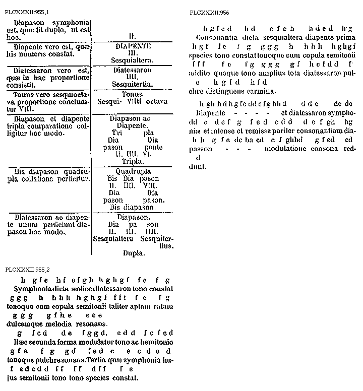 [PLCXXXII:955,1; text: Diapason symphonia est, quae fit duplo, ut est hoc. II. Diapente vero est, quae his numeris constat. DIAPENTE, III. Sesquialtera. Diatessaron vero est, quae in hac proportione consistit. Diatessaron, IIII. Sesquitertia. Tonus vero sesquioctava proportione concluditur VIII. Tonus, Sesquioctava, VIIII, Diapason et diapente tripla comparatione colligitur hoc modo. Diapason ac Diapente. Tripla, Diapason, Diapente, VI. Bis diapason quadrupla collatione perficitur. Quadrupla, Bis Diapason, VIII. Diatessaron ac diapente unum perficiunt diapason hoc modo. Sesquitertius. Dupla.] [ALIMU 02GF]