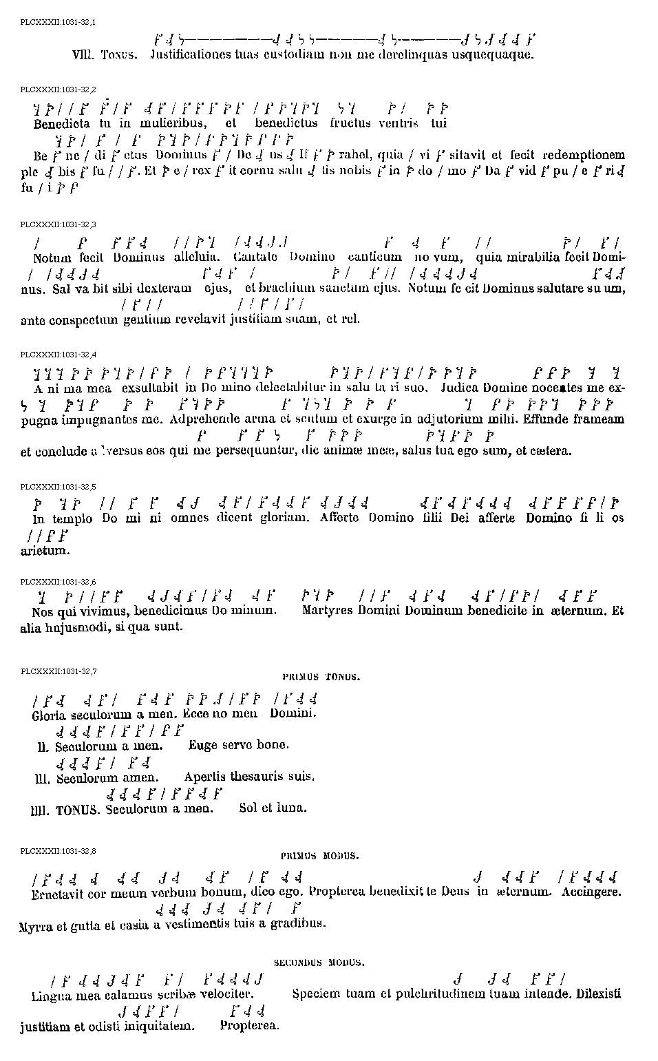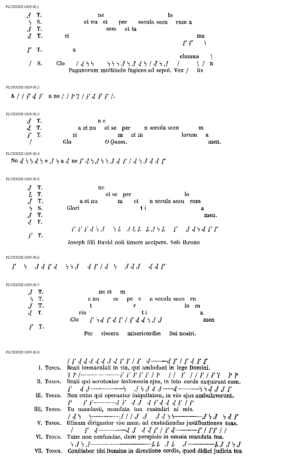[PLCXXXII:1029-30,8; text: Primus Tonus. Beati immaculati in via, qui ambulant in lege Domini. Secundus Tonus. Beati qui scrutantur testimonia ejus, in toto corde exquirunt eum. Tertius Tonus. Non enim qui operantur iniquitatem, in viis ejus ambulaverunt. Quartus Tonus. Tu mandasti, mandata tua custodiri nimis. Quintus Tonus. Utinam dirigantur viae meae, ad custodiendas justificationes tuas. Sextus Tonus. Tunc non confundar, dum perspicio in omnia mandata tua. Septimus Tonus. Confitebor tibi Domine in directione cordis, quod didici judicia tua.] [ANOCOBR 02GF]