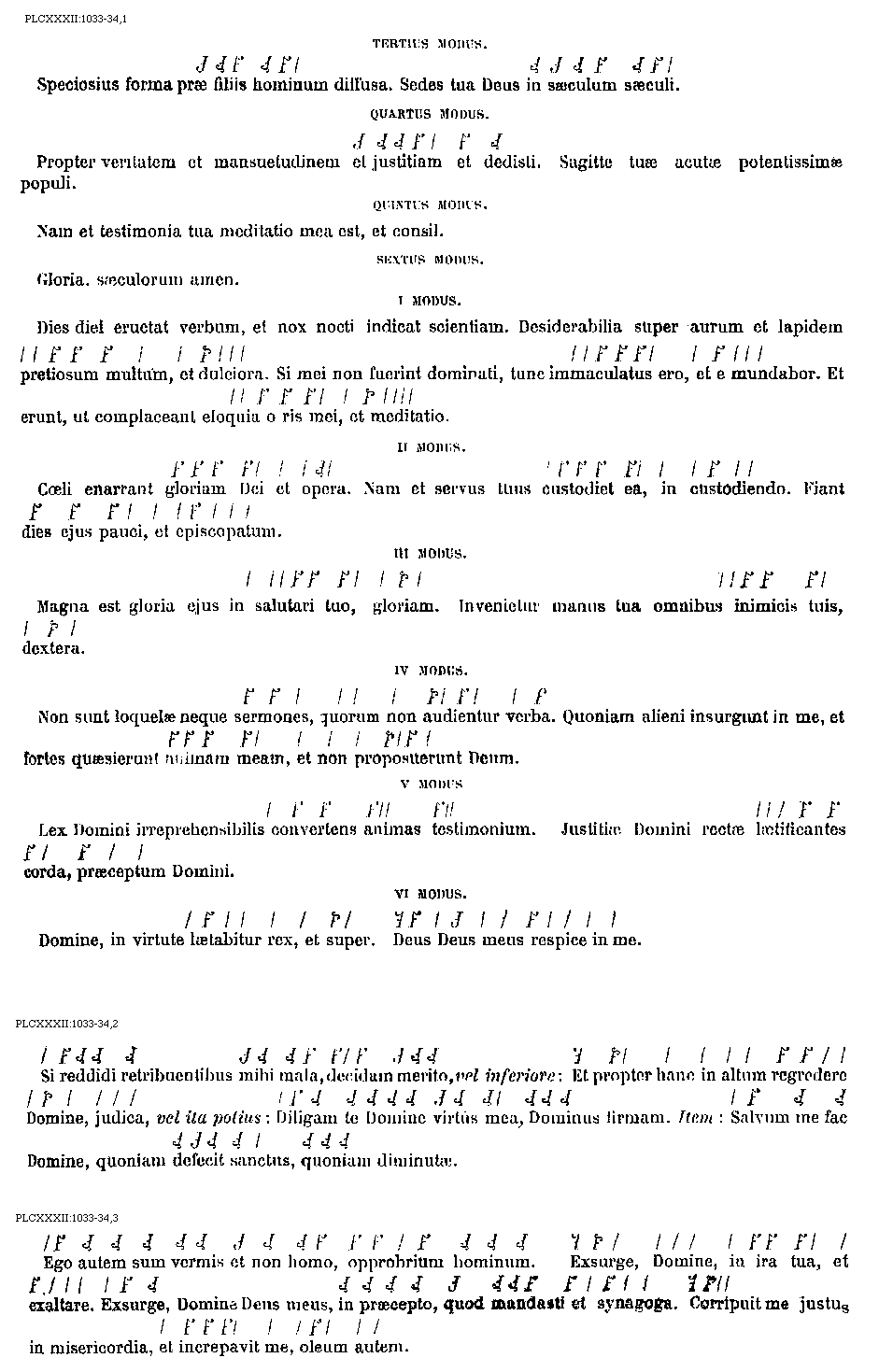 [1033-34] [PLCXXXII:1033-34,1; text: Tertius modus. Speciosius forma prae filiis hominum diffusa. Sedes tua Deus in saeculum saeculi. Quartus modus. Propter veritatem et mansuetudinem et justitiam et dedisti. Sagitte tuae acutae potentissimae populi. Quintus modus. Nam et testimonia tua meditatio mea est, et consilium. Sextus modus. Gloria. saeculorum amen. Primus modus. Dies diei eructat verbum, et nox nocti indicat scientiam. Desiderabilia super aurum et lapidem pretiosum multum, et dulciora. Si mei non fuerint dominati, tunc immaculatus ero, et emundabor. Et erunt, ut complaceant eloquia oris mei, et meditatio. Secundus modus. Coeli enarrant gloriam Dei et opera. Nam et servus tuus custodiet ea, in custodiendo. Fiant dies ejus pauci, et episcopatum. Tertius modus. Magna est gloria ejus in salutari tuo, gloriam. Invenietur manus tua omnibus inimicis tuis, dextera. Quartus modus. Non sunt loquelae neque sermones, quorum non audientur verba. Quoniam alieni insurgunt in me, et fortes quaesierunt animam meam, et non proposuerunt Deum. Quintus modus. Lex Domini irreprehensibilis convertens animas testimonium. Justitiae Domini rectae laetificantes corda, praeceptum Domini. Sextus modus. Domine, in virtute laetabitur rex, et super. Deus Deus meus respice in me.] [ANOCOBR 04GF]