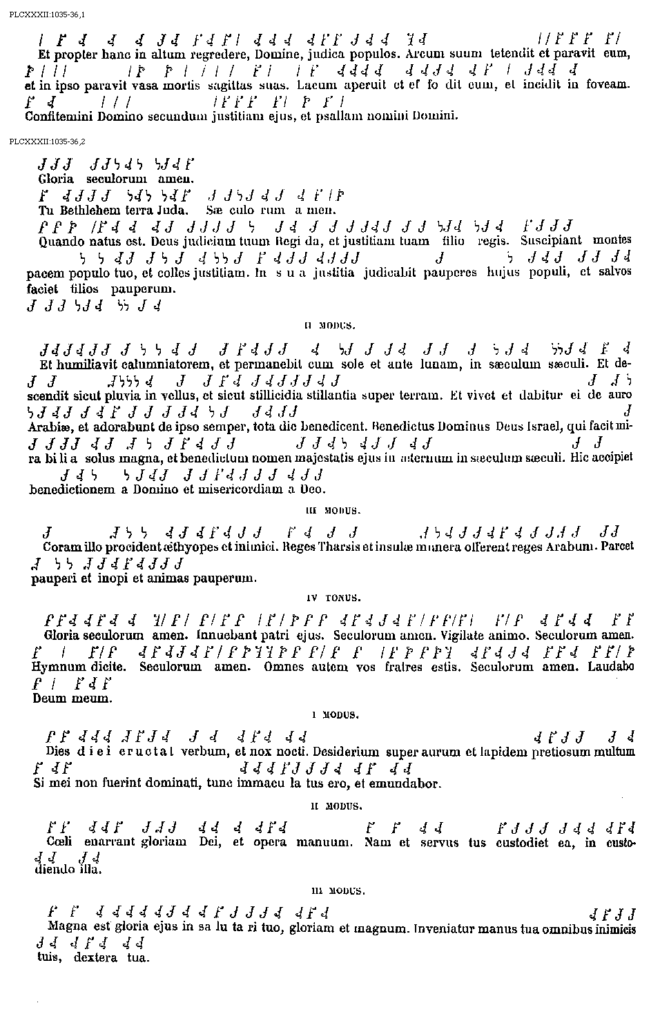 [PLCXXXII:1035-36,2; text: Gloria seculorum amen. Tu Bethlehem terra Juda. Saeculorum amen. Quando natus est. Deus judicium tuum Regi da, et justitiam tuam filio regis. Suscipiant montes pacem populo tuo, et colles justitiam. In sua justitia judicabit pauperes hujus populi, et salvos faciet filios pauperum. Secundus modus. Et humiliavit calumniatorem, et permanebit cum sole et ante lunam, in saeculum saeculi. Et descendit sicut pluvia in vellus, et sicut stillicidia stillantia super terram. Et vivet et dabitur ei de auro Arabiae, et adorabunt de ipso semper, tota die benedicent. Benedictus Dominus Deus Israel, qui facit mirabilia solus magna, et benedictum nomen majestatis ejus in aeternum in saeculum saeculi. Hic accipiet benedictionem a Domino et misericordiam a Deo. Tertius modus. Coram illo procident aethyopes et inimici. Reges Tharsis et insulae munera offerent reges Arabum. Parcet pauperi et inopi et animas pauperum. Quartus tonus. Gloria seculorum amen. Innuebant patri ejus. Seculorum amen. Vigilate animo. Hymnum dicite. Omnes autem vos fratres estis. Laudabo Deum meum. Primus modus. Dies diei eructat verbum, et nox nocti. Desiderium super aurum et lapidem pretiosum multum Si mei non fuerint dominati, tunc immaculatus ero, et emundabor. Secundus modus. Coeli enarrunt gloriam Dei, et opera manuum. Nam et servus tus custodiet ea, in custodiendo illa. Tertius modus. Magna est gloria ejus in salutari tuo, gloriam et magnum. Inveniatur manus tua omnibus inimicis tuis, dextera tua.] [ANOCOBR 05GF]