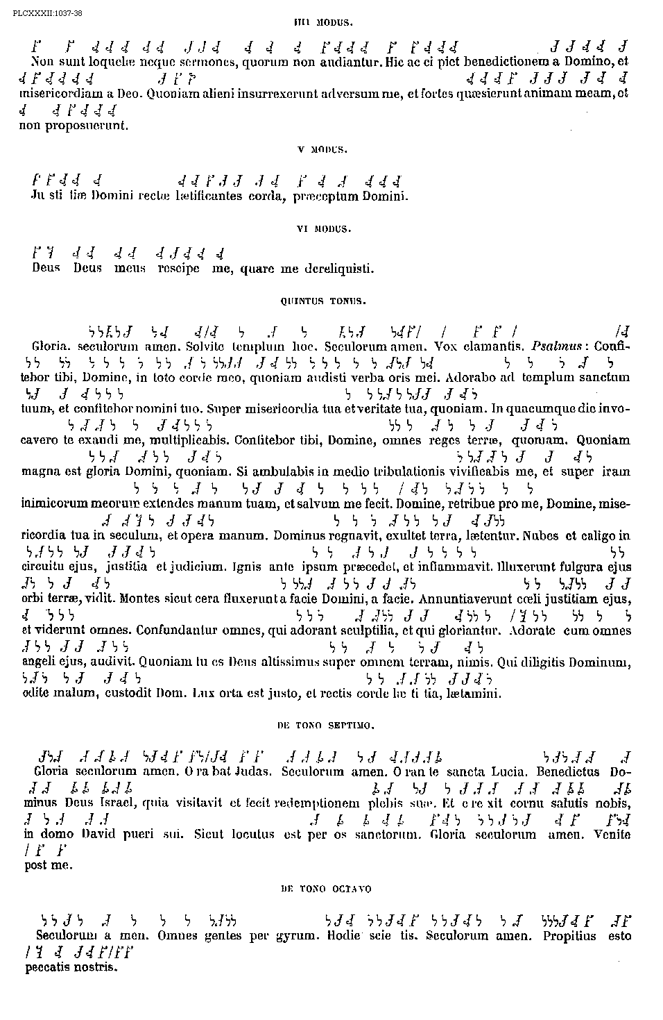 [1037-38] [PLCXXXII:1037-38; text: Quartus modus. Non sunt loquelae neque sermones, quorum non audiantur. Hic accipiet benedictionem a Domino, et misericordiam a Deo. Quoniam alieni insurrexerunt adversum me, et fortes quaesierunt animam meam, et non proposuerunt. Quintus modus. Justitiae Domini rectae laetificantes corda, praeceptum Domini. Sextus modus. Deus Deus meus rescipe me, quare me dereliquisti. Quintus Tonus. Gloria. seculorum amen. Solvite templum hoc. Vox clamantis. Psalmus: Confitebor tibi, Domine, in toto corde meo, quoniam audisti verba oris mei. Adorabo ad templum sanctum tuum, et confitebor nomini tuo. Super misericordia tua et veritate tua, quoniam. In quacumque die invocavero te exaudi me, multiplicabis. Confitebor tibi, Domine, omnes reges terrae, quoniam. Quoniam magna est gloria Domini, quoniam. Si ambulabis in medio tribulationis vivificabis me, et super iram inimicorum meorum extendes manum tuam, et salvum me fecit. Domine, retribue pro me, Domine, misericordia tua in seculum, et opera manum. Dominus regnavit, exultet terra, laetentur. Nubes et caligo in circuitu ejus, justitiam et judicium. Ignis ante ipsum praecedet, et inflammavit. Illuxerunt fulgura eius orbi terrae, vidit. Montes sicut cera fluxerunt a facie Domini, a facie. Annuntiaverunt coeli iustitiam ejus, et viderunt omnes. Confundantur omnes, qui adorant sculptilia, et qui gloriantur. Adorate eum omnes angeli ejus, audivit. Quoniam tu es Deus altissimus super omnem terram, nimis. Qui diligitis Dominum, odite malum, custodit Dominus. Lux orta est justo, et rectis corde laetitia, laetamini. De tono septimo. Gloria seculorum amen. Orabat Judas. Orante sancta Lucia. Benedictus Dominus Deus Israel, quia visitavit et fecit redemptionem plebis suae. Et erexit cornu salutis nobis, in domo David pueri sui. Sicut locutus est per os sanctorum. Venite post me. De tono octavo. Omnes gentes per gyrum. Hodie scietis. Propitius esto peccatis nostris.] [ANOCOBR 06GF]