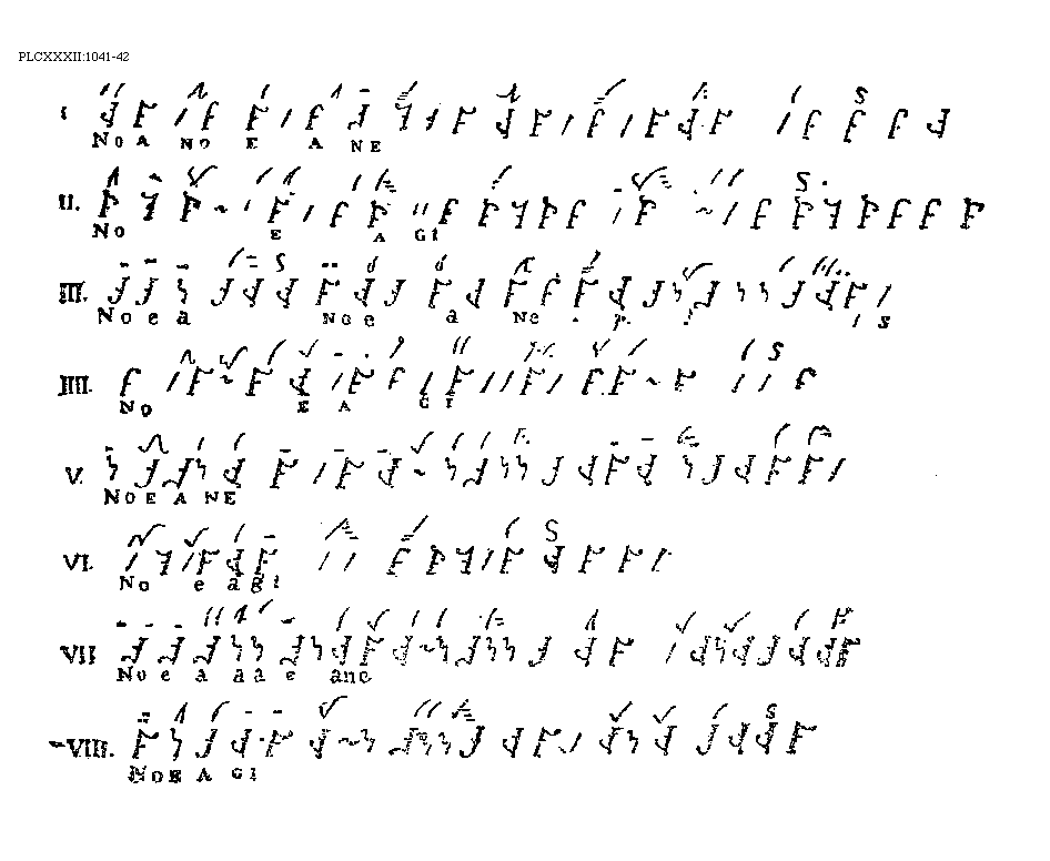 [PLCXXXII:1041-42; text: I. II. III. IV. V. VI. VII. VIII. Noanoeane, Noeagi, Noeanoeane, Noeane, Noeaaaeane] [ANOCOBR 08GF]