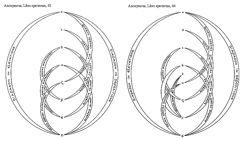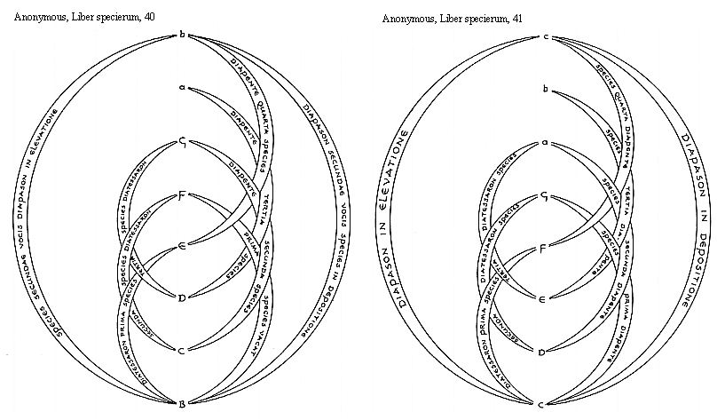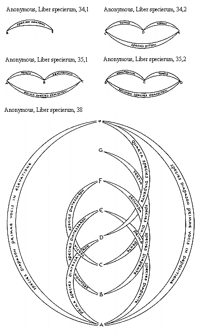 [Anonymous, Liber specierum, 41; text: diatessaron prima species, secunda, tertia, quarta, diapente, diapason in elevatione, in depositione, C, D, E, F, G, a, [sqb], c] [ANOSPEG 02GF]