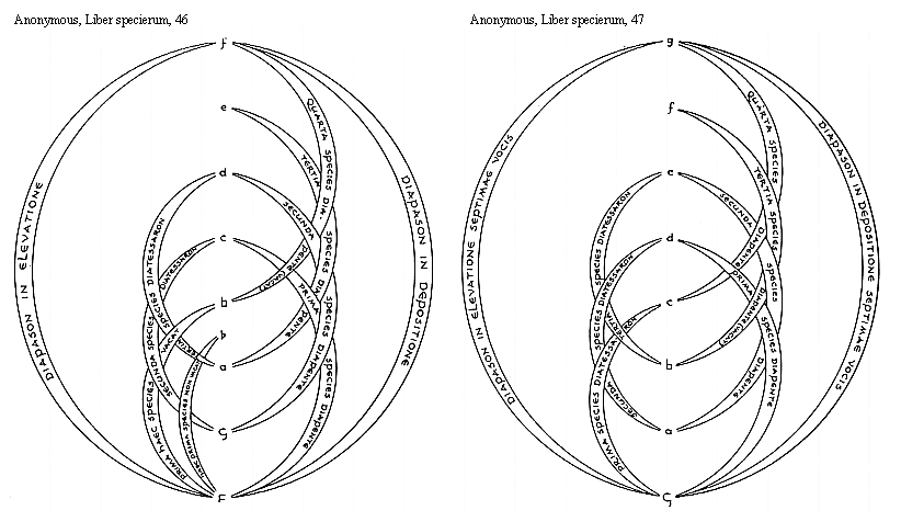 [Anonymous, Liber specierum, 47; text: prima species diatessaron, secunda, tertia, quarta, diapente, (vacat), diapason in elevatione septimae vocis, in depositione, a, [sqb], c, d, e, f, G, g] [ANOSPEG 04GF]