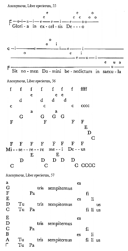 [Anonymous, Liber specierum, 55; text: F, c, a, e, i, o, u, Gloria in excelsis Deo, Sit nomen Domini benedictum in saecula] [ANOSPEG 05GF]
