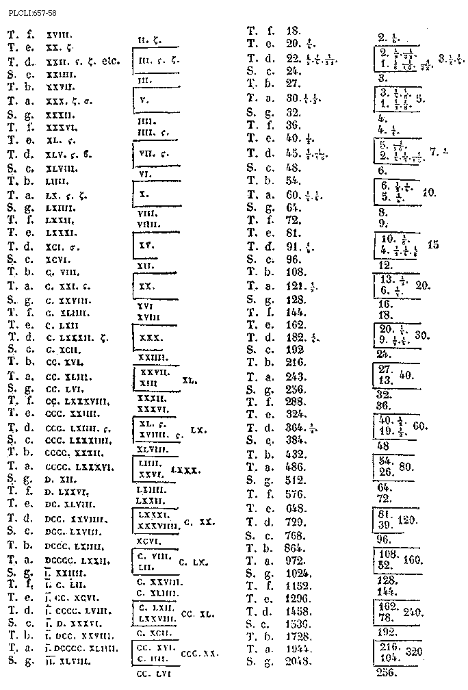 [PLCLI:657-58; text: Tonus, Semitonium, f. e. d. c. b. a. g. XVIII. XX. [zeta]. XXII. [stigma]. [zeta]. et caetera, XXIIII. XXVII. XXX. [zeta]. [sigma]. XXXII. XXXVI. XL. [stigma]. XLV. [stigma]. [beta]. XLVIII. LIIII. LX. [stigma]. [zeta]. LXIIII. LXXII. LXXXI. XCI. [sigma]. XCVI. C. VIII. C. XXI. [stigma]. C. XXVIII. C. XLIIII. C. LXII. C. LXXXII. [zeta]. C. XCII. CC. XVI. CC. XLIII. CC. LVI. CC. LXXXVIII. CCC. XXIIII. CCC. LXIIII. [stigma]. CCC. LXXXIIII. CCCC. XXXII. CCCC. LXXXVI. D. XII. D. LXXVI. DC. XLVIII. DCC. XXVIIII. DCC. LXVIII. DCCC. LXIIII. DCCCC. LXXII. I[macron supra lin.]. XXIIII. I[macron supra lin.]. C. LII. I[macron supra lin.]. CC. XCVI. I[macron supra lin.]. CCCC. LVIII. I[macron supra lin.]. D. XXXVI. I[macron supra lin.]. DCC. XXVIII. I[macron supra lin.]. DCCCC. XLIIII. II[macron supra lin.]. XLVIII. II. [zeta]. III. [stigma]. [zeta]. III. V. IIII. IIII. [stigma]. VII. [stigma]. VI. X. VIII. VIIII. XV. XII. XX. XVI, XVIII, XXX. XXIIII. XXVII. XIII, XXXII. XXXVI. XL. [stigma]. XVIIII. [stigma]. XLVIII. LIIII. XXVI. LXIIII. LXXII. LXXXI. XXXVIIII. XCVI. C. VIII. LII. C. XXVIII. C. XLIIII. C. LXII. LXXVIII. C. XCII. CC. XVI. C. IIII. CC. LVI, XL. LX. LXXX. C. XX. C. LX. CC. XL. CCC. XX. 18. 20. 1/4. 22. 1/2. 1/4. 1/32. 24. 27. 30. 1/4. 1/3. 32. 36. 40. 1/2. 45. 1/2. 1/16. 48. 54. 60. 1/2. 1/4. 64. 72. 81. 91. 1/8. 96. 108. 121. 1/2. 128. 144. 162. 182. 1/4. 192, 216. 243. 256. 288. 324. 364. 1/2. 384. 432. 486. 512. 576. 648 729. 768. 864. 972. 1024. 1152. 1296. 1458. 1536. 1728. 1944. 2048. 2. 1/4. 2. 1/2. 1/32. 1. 1/8 1/16. 1/32. 3. 3. 1/4. 1/8. 1. 1/2. 1/8. 4. 4. 1/2. 5. 1/16. 2. 1/4. 1/8. 1/16. 6. 6. 1/2. 1/4. 5. 1/4. 8. 9. 10. 1/8. 4. 1/2. 1/4. 1/8, 12. 13. 1/2. 6. 1/2. 16. 18. 20. 1/4. 9. 1/2. 1/4. 24. 27. 13. 32. 36. 40. 1/2. 19. 1/2. 48, 54. 26. 64. 72. 81. 39. 96. 108. 52. 128. 144. 162. 78. 192. 216. 104. 256. 3. 1/2. 1/4. 5. 7. 1/2. 10. 15, 20. 30. 40. 60. 80. 120. 160. 240. 320] [BERNDIVM 01GF]