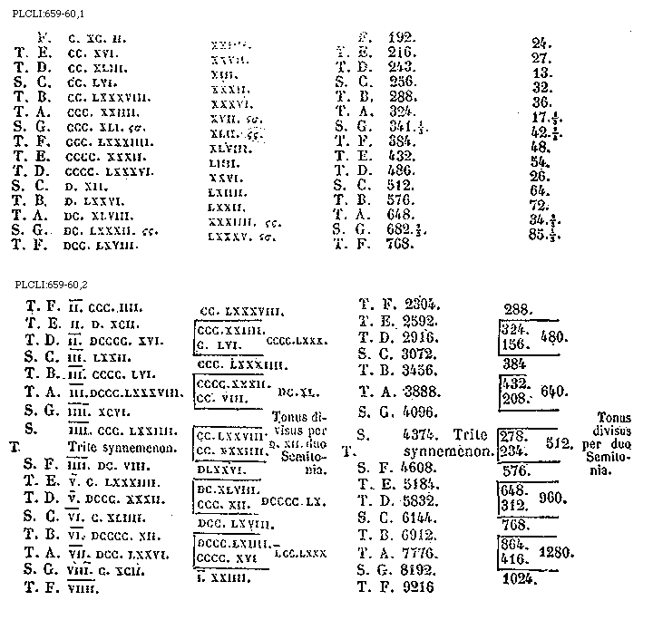 [PLCLI:659-60,2; text: Tonus, Semitonium, F. E. D. C. B. A. G. II[macron supra lin.]. CCC. IIII. II. D. XCII. II[macron supra lin.]. DCCCC. XVI. III[macron supra lin.]. LXXII. III[macron supra lin.]. CCCC. LVI. III[macron supra lin.]. DCCC. LXXXVIII. IIII[macron supra lin.]. XCVI. IIII[macron supra lin.]. CCC. LXXIIII. Trite synnemenon. IIII[macron supra lin.]. DC. VIII. V[macron supra lin.]. C. LXXXIIII. V[macron supra lin.]. DCCC. XXXII. VI[macron supra lin.]. C. XLIIII. VI[macron supra lin.]. DCCCC. XII. VII[macron supra lin.]. DCC. LXXVI. VIII[macron supra lin.]. C. XCII. VIIII[macron supra lin.]. CC. LXXXVIII. CCC. XXIIII. C. LVI. CCC. LXXXIIII. CCCC. XXXII. CC. VIII. CC. LXXVIII. CC. XXXIIII. DLXXVI. DC. XLVIII. CCC. XII. DCC. LXVIII. DCCC. LXIIII. CCCC. XVI, I[macron supra lin.]. XXIIII. CCCC. LXXX. DC. XL. Tonus divisus per duo Semitonia. D. XII. DCCCC. LX. I[macron supra lin.]. CC. LXXX, 2304. 2592. 2916. 3072. 3456. 3888. 4096. 4374. 4608. 5184. 5832. 6144. 6912. 7776. 8192. 9216, 288. 324. 156. 384, 432. 208. 278. 234. 576. 648. 312. 768. 864. 416. 1024. 480. 640. 512. 960. 1280.] [BERNDIVM 02GF]