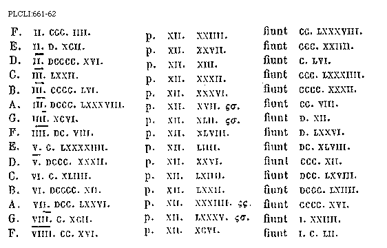 [PLCLI:661-62; text: F. E. D. C. B. A. G. II. CCC. IIII. II. D. XCII. II[macron supra lin.]. DCCCC. XVI. III[macron supra lin.]. LXXII. III[macron supra lin.]. CCCC. LVI. III[macron supra lin.]. DCCC. LXXXVIII. IIII[macron supra lin.]. XCVI. IIII[macron supra lin.]. DC. VIII. V. C. LXXXXIIII. V[macron supra lin.]. DCCC. XXXII. VI. C. XLIIII. VI. DCCCC. XII. VII. DCC. LXXVI. VIII[macron supra lin.]. C. XCII. VIIII[macron supra lin.]. CC. XVI. p. XII. XXIIII. XII. XXVII. XII. XIII. XII. XXXII. XII. XXXVI. XII. XVII. [stigma][sigma]. XII. XLII. [stigma][sigma]. XII. XLVIII. XII. LIIII. XII. XXVI. XII. LXIIII. XII. LXXII. XII. XXXIIII. [stigma][stigma]. XII. LXXXV. [stigma][sigma]. XII. XCVI. fiunt CC. LXXXVIII. CCC. XXIIII. C. LVI. CCC. LXXXIIII. CCCC. XXXII. CC. VIII. D. XII. D. LXXVI. DC. XLVIII. CCC. XII. DCC. LXVIII. DCCC. LXIIII. CCCC. XVI. I. XXIIII. I. C. LII.] [BERNDIVM 03GF]