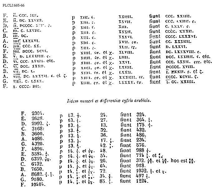 [PLCLI:665-66; text: F. E. D. C. B. A. G. II[macron supra lin.]. CCC. IIII. II[macron supra lin.]. DC. XXVIII. II[macron supra lin.]. DCCCC. XCII. [stigma]. III[macron supra lin.]. C. LXVIII. III[macron supra lin.]. DC. IIII[macron supra lin.]. LXXXVI. IIII[macron supra lin.]. CCC. XX. IIII[macron supra lin.]. DCCC. XCVI. V[macron supra lin.]. D. LXXXIIII. [stigma]. VI[macron supra lin.]. CCC. LVIIII. et caetera. VI[macron supra lin.]. DCC. XXXII. VII[macron supra lin.]. DC. L. VIII[macron supra lin.]. DC. LXXXII. [stigma]. et [zeta]. VIIII[macron supra lin.]. C. LXXX. X[macron supra lin.]. CCCC. IIII. p XIII. [stigma]. XIIII. [stigma][sigma]. et [chi]. XXIIII. XXVII. XIII. XXXII. XXXVI. XVII. [stigma][sigma]. XLII. [stigma][stigma]. XLVIII. LIIII. XXVI. LXIIII. LXXII. XXXIIII. [stigma][stigma]. LXXXV. [stigma][sigma]. fiunt CCC. XXIIII. CCC. LXIIII. [stigma]. C. LXXV. [stigma]. CCCC. XXXII. CCCC. LXXXVI. CC. XXXIIII. D. LXXVI. DC. LXXXVIII. [stigma]. DCC. LXXIIII. [stigma]. CCC. LXXII. [stigma][stigma][stigma]. DCCCC. XVIIII. I[macron supra lin.]. XXXII. [stigma]. et [zeta]. CCCC. XCVII. [zeta]. I[macron supra lin.]. CC. XXIIII. Iidem numeri et differentiae cyfris arabicis. 2304. 2628. 2992. 1/2. 3168: 3600. 4086. 4320. 4896. 5584. 1/2. 6359. 6/96. 6732. 7650. 8682. 1/2. 1/4. 9180. 10404. 13. 1/2. 14. 1/3. et 1/96. 24. 27. 13. 32. 36. 17. 1/3. 42. 2/3. 48. 54. 26. 64. 72. 34. 2/3. 85. 1/3. fiunt 324. 364. 1/2. 175. 1/2. 432. 486. 234. 576. 988 1/2. 774 1/2. et 6/96 372. 10/12. et 10/96. hoc est 90/96. 918. 1032. 1/2. et 1/4. 497 1/4. 1224.] [BERNDIVM 04GF]