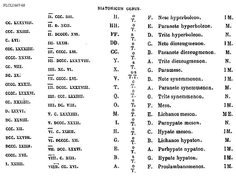 [PLCLI:667-68; text: DIATONICUM GENUS. CC. LXXXVIII. CCC. XXIIII. C. LVI. CCC. LXXXIIII. CCCC. XXXII. CC. VIII. DC. XL. CCCC. XXXII. CCCC. LXXXVI. CC. XXXIIII. D. LXXVI. DC. XLVIII. CCC. XII. DCC. LXVIII. DCCC. LXIIII. CCCC. XVI. I. XXIIII. II[macron supra lin.]. CCC. IIII. II[macron supra lin.]. D. XCII. II[macron supra lin.]. DCCCC. XVI. III. LXXII. III[macron supra lin.]. CCCC. LVI. III[macron supra lin.]. DCCC. LXXXVIII. IIII. XC. VI. III[macron supra lin.]. CCCC. LVI. III[macron supra lin.]. DCCC. LXXXVIII. IIII. CCC. LXXIIII. IIII. DC. VIII. V. C. LXXXIIII. V. DCCC. XXXII. VI[macron supra lin.]. C. XLIIII. VI[macron supra lin.]. DCCCC. XII. VII[macron supra lin.]. DCC. LXXVI. VIII[macron supra lin.]. C. XCII. VIIII[macron supra lin.]. CC. XVI. H. HH. FF. DD. CC. Y. X. V. T. Q. O. M. I. G. E. B. A. Tonus, Semitonium, F. E. D. C. B. A. G. Nete hyperboleon. Paranete hyperboleon. Trite hyperboleon. Nete diezeugmenon. Paranete diezeugmenon. Trite diezeugmenon. Paramese. Nete synemmenon. Paranete synemmenon. Trite synemmenon. Mese. Lichanos meson. Parnypate meson. Hypate meson. Lichanos hypaton. Parhypate nypaton. Hypate hypaton. Proslambanomenos. IM. M. N. ME.] [BERNDIVM 05GF]