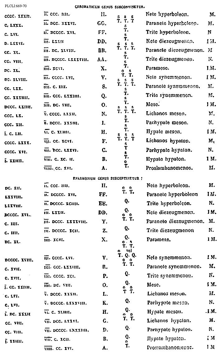 [669-70] [PLCLI:669-70; text: CHROMATICUM GENUS SUBCONTINETUR. CCCC. XXXII. C. LXXX. C. LVI. D. LXXVI. CC. XL. CC. VIII. DC. XL. DC. XLVIII. CC. LXX. CC. XXXIIII. DCCC. LXIIII. CCC. LX. CCC. XII. I[macron supra lin.]. C. LII. CCCC. LXXX. CCCC. XVI. I[macron supra lin.]. XXIIII. II[macron supra lin.]. CCC. IIII. II[macron supra lin.]. DCC. XXXVI. II[macron supra lin.]. DCCCC. XVI. III[macron supra lin.]. LXXII. III[macron supra lin.]. DC. XLVIII. III[macron supra lin.]. DCCC. LXXXVIII. IIII[macron supra lin.]. XCVI. III[macron supra lin.]. CCCC. LVI. IIII[macron supra lin.]. C. IIII. IIII[macron supra lin.]. CCC. LXXIIII. IIII[macron supra lin.]. DC. VIII. V[macron supra lin.]. CCCC. LXXII. V[macron supra lin.]. DCCC. XXXIII. VI[macron supra lin.]. C. XLIIII. VII[macron supra lin.]. CC. XCVI. VII[macron supra lin.]. DCC. LXXVI. VIII[macron supra lin.]. C. XC. II. VIIII[macron supra lin.]. CC. XVI. H. GG. FF. DD. BB. AA. X. V. S. Q. O. N. I. H. F. C. B. A. Semitonium, Tonus, Nete hyperboleon. Paranete hyperboleon. Trite hyperboleon. Nete diezeugmenon. Paranete diezeugmenon. Trite diezeugmenon. Paramese. Nete synemmenon. Paranete synemmenon. Trite synemmenon. Mese. Lichanos meson. Parhypate meson. Hypate meson. Lichanos hypaton. Parhypate hypaton. Hypate hypaton. Proslambanomenos. M. N. IM. ENARMONIUM GENUS SUBCONTINETUR: DC. XII. LXXVIII. DCCCC. XVI. C. IIII. DC. XL. DCCCC. XVIII. C. XVII. I[macron supra lin.]. CC. XXIIII. C. LVI. I[macron supra lin.]. DC. XXXII. CC. VIII. I[macron supra lin.]. XXIIII. II[macron supra lin.]. CCC. IIII. II[macron supra lin.]. DCCCC. XVI. II[macron supra lin.]. DCCCC. XCIIII. III[macron supra lin.]. LXXII. III[macron supra lin.]. DCCC. LXXXVIII. III[macron supra lin.]. DCCCC. XCII. IIII[macron supra lin.]. XCVI. III[macron supra lin.]. CCCC. LVI. IIII[macron supra lin.]. CCC. LXXIIII. IIII[macron supra lin.]. CCCC. XCI. IIII[macron supra lin.]. DC. VIII. V[macron supra lin.]. DCCC. XXXII. V[macron supra lin.]. DCCCC. LXXXVIII. VI[macron supra lin.]. C. XLIIII. VII[macron supra lin.]. DCC. LXXVI. VII[macron supra lin.]. DCCCC. LXXXIIII. VIII[macron supra lin.]. C. XCII. VIIII[macron supra lin.]. CC. XVI. EE. Y. Z. R. P. L. K. G. D. vel] [BERNDIVM 06G]