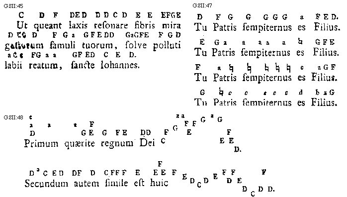 [GSII:45; text: C, D, E, F, G, a, Ut queant laxis resonare fibris mira gestorum famuli tuorum, solve polluti labii reatum, sancte Iohannes.] [GUIEPI 01GF]
