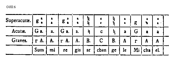 [GSII:6; text: Superacutae. Acutae. Graves. gaa, aa, [sqb][sqb], cc, g, Ga. a. [sqb], c, a, G, [Gamma] A. A. B. C, A, [Gamma], Summi regis archangele Michael.] [GUIMIC 01GF]