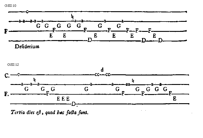 [GSII:12; text: C. F. c, a, G, [sqb], F, E, D. cc, d, aa, Tertia dies est, quod haec facta sunt.] [GUIMIC 04GF]
