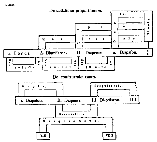 [GSII:15; text: De collatione proportionum. Quadrupla. Tripla. Dupla. Simpla. G. Tonus. A. Diatessaron. D. Diapente. a. Diapason. aa. Sesquioctava. Sesquitertia. Sesquialtera. De construendo cantu. Dupla. Sesquitertia. I. Diapason. II. Diapente. III. Diatessaron. IIII. Sesquialtera. Sesquioctava. VIII, VIIII] [GUIMIC 05GF]
