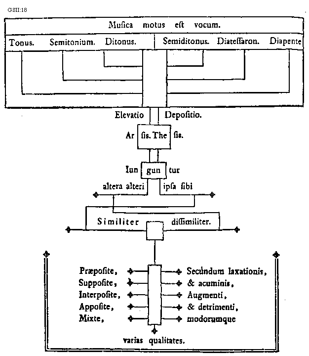 [GSII:18; text: Musica motus est vocum. Tonus. Semitonium. Ditonus. Semiditonus. Diatessaron. Diapente, Elevatio, Depositio. Arsis. Thesis. Iunguntur, altera alteri, ipsa sibi, Similiter, dissimiliter. Praeposite, Supposite, Interposite, Apposite, Mixte, Secundum laxationis, et acuminis, Augmenti, et detrimenti, modorumque, varias qualitates.] [GUIMIC 06GF]