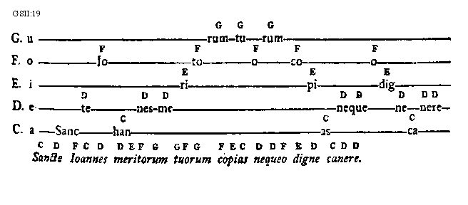 [GSII:19; text: G. u, F. o, E. i, D. e, C. a, Sancte Ioannes meritorum tuorum copias nequeo digne canere.] [GUIMIC 07GF]