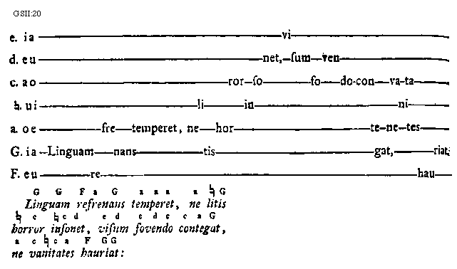 [GSII:20; text: e. ia, d. eu, c. ao, [sqb]. ui, a. oe, G. ia, F. eu, Linguam refrenans temperet, ne litis horror insonet, visum fovendo contegat, ne vanitates hauriat:] [GUIMIC 08GF]