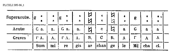 [PLCXLI:385-86,1; text: Superacutae. Acutae, Graves, g, aa, [sqb][sqb], cc, a. [sqb], c, G, [Gamma], A., B., C, A, Summi regis archangele Michacl] [GUIMICRO 01GF]