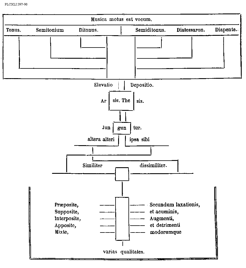 Igitur motus vocum, qui sex modis consonanter fieri dictus est, fit arsi et thesi, id est, elevatione et depositione: quorum gemino motu, id est, arsis et thesis, omnis neuma formatur, praeter repercussas aut simplices. Deinde arsis et thesis tum sibimet junguntur, ut arsis arsi, thesis thesi, tum altera [398] alteri, ut arsis thesi, et thesis arsi conjungitur, ipsaque conjunctio tum fit ex similibus, tum ex dissimilibus. Dissimilitudo autem erit, si ex praedictis motibus, id est, tonis, semitonis, ditonis et caeteris alius alio plures paucioresve habeat voces, aut magis conjunctas vel disjunctas dissimiliter, deinde vel similiter facta conjunctione motus motui tum erit praepositus, id est in superioribus positus, tum suppositus tum appositus, id est, cum in eadem voce unius motus finis erit, alteriusque principium; tum interpositus, id est, quando unus motus infra alium positus et minus est gravis et minus acutus; tum id commixtus, est, partim interpositus partimque suppositus, aut prae positus, aut appositus, rursusque hae positiones dirimi possunt secundum laxationis et acuminis, augmenti et detrimenti, modorum quoque varias qualitates. Neumae quoque per eosdem modos arsis et thesis poterunt variari, et distinctiones aliquando. Qua de re et descriptionem subjecimus, quo facilior per oculos via sit.