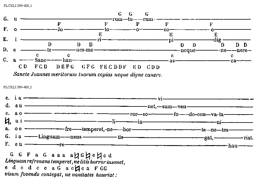 Ecce finis distinctionis in trito C. a quo non deponimus organum, quia non habet sub se tonum vel ditonum, quibus fit occursus, sed habet semiditonum, per quem non fit occursus. [PLCXLI:403,2; text: F, G, a, E, C, D, servo fidem] [GUIMICRO 08GF]
