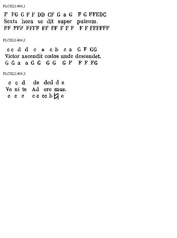 [404] [PLCXLI:404,1; text: F, G, D, C, E, a, Sexta hora sedit super puteum.] [GUIMICRO 09GF]