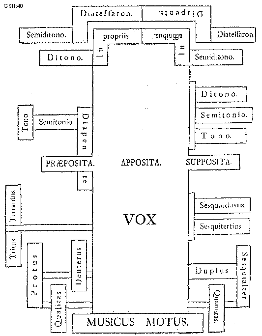 [GSII:40; text: Vox, Musicus motus. Diatessaron. Diapente. Semiditono. Ditono. Tono. Semitonio. In propriis, In affinibus. Praeposita. Apposita. Supposita. Sesquioctavus. Sesquitertius. Sesquialter. Duplus, Protus, Deuterus, Tritus. Tetrardus, Qualitas, Quantitas.] [GUIPRAN 01GF]