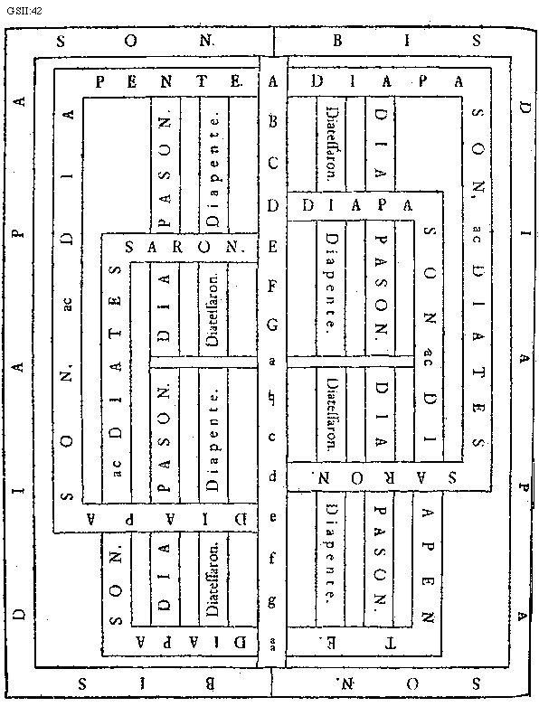 [42] [GSII:42; text: BIS DIAPASON. DIAPASON ac DIAPENTE. DIAPASON ac DIATESSARON. DIAPASON. Diatessaron. Diapente. A, B, C, D, E, F, G, A, [sqb], c, d, e, f, g, aa] [GUIPRAN 02GF]